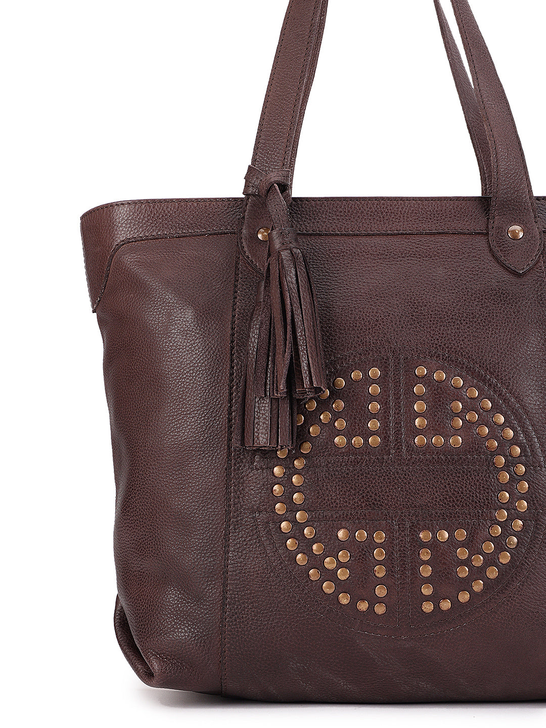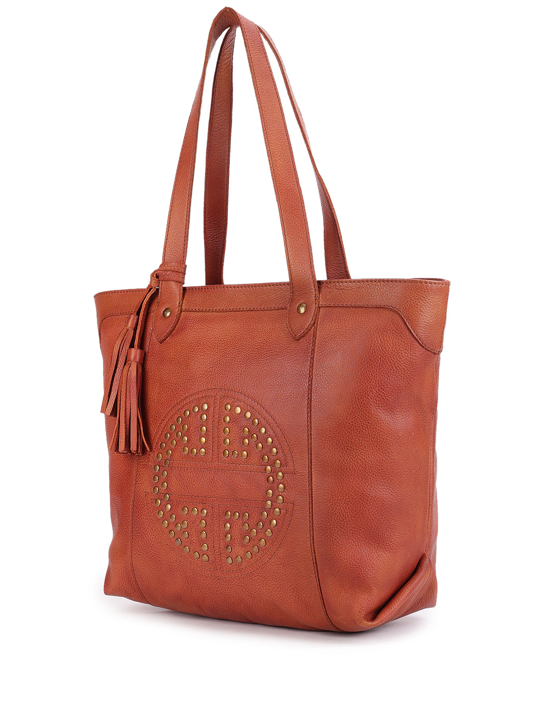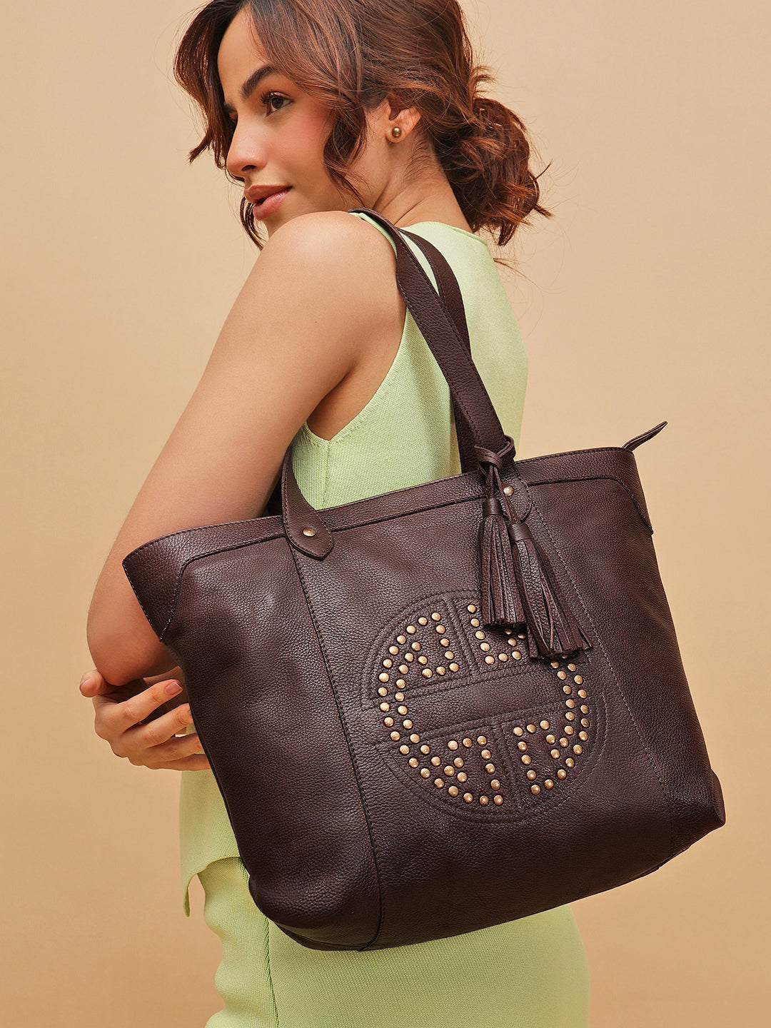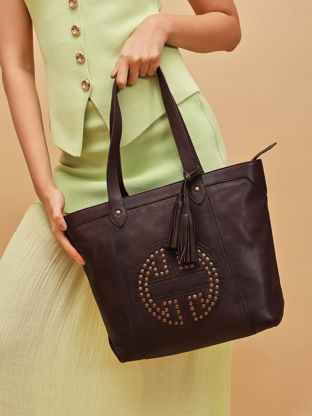 A stylish tan tote crafted in rich leather, featuring the Classicuir logo in rivets, dual shoulder straps, and playful tassel accents—perfect for effortless, everyday sophistication.