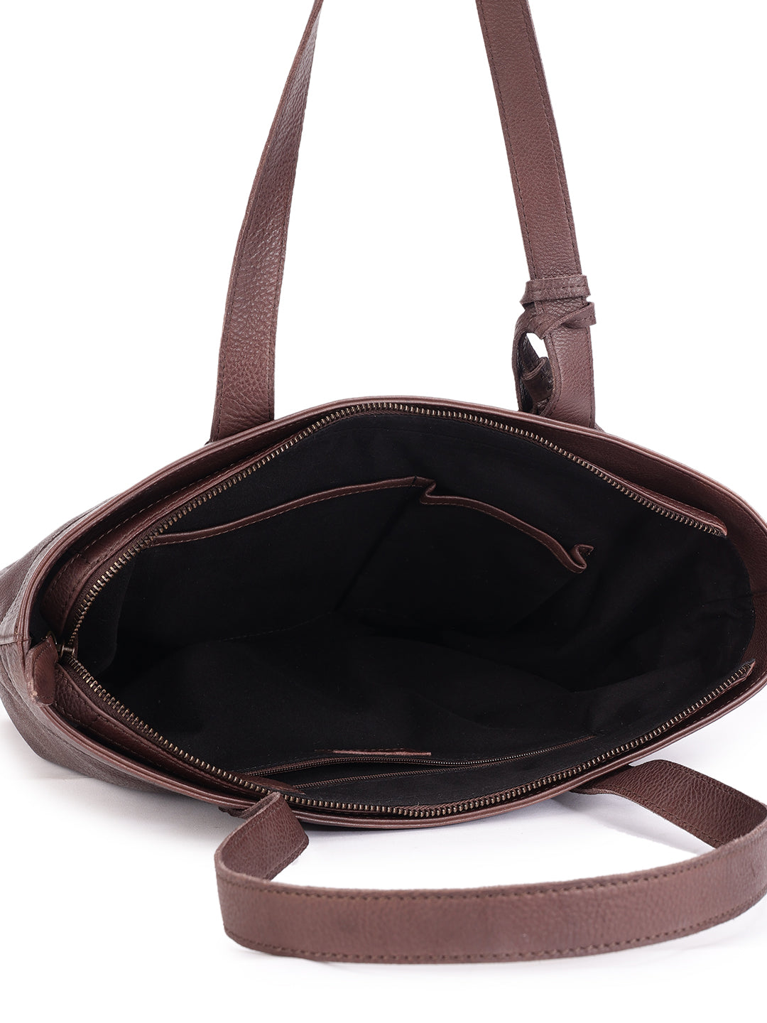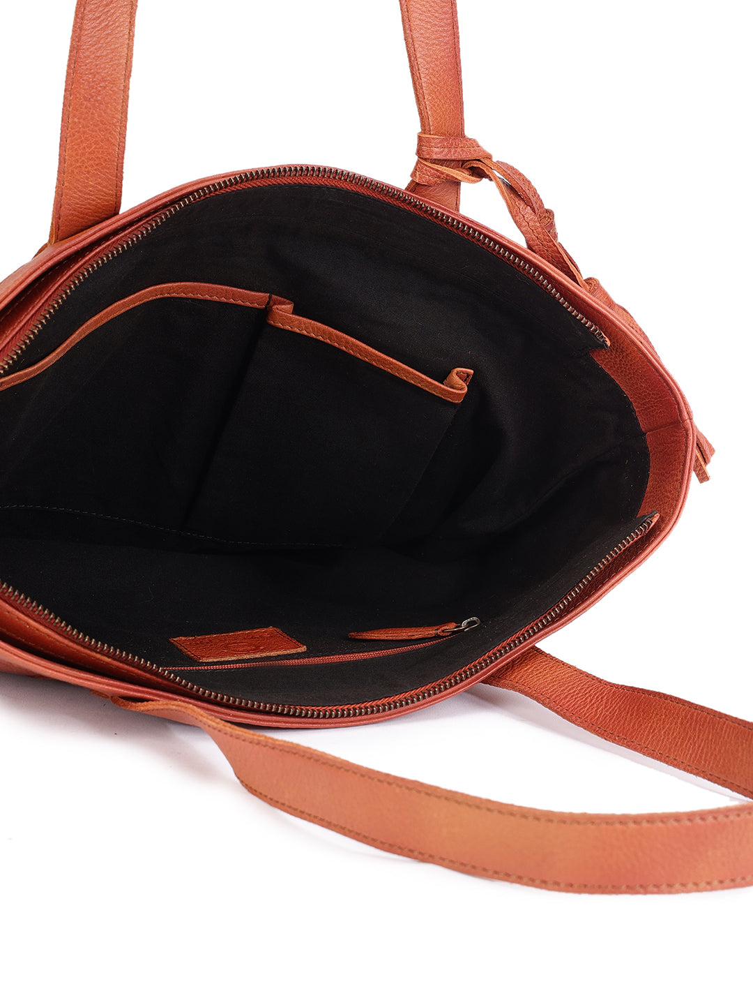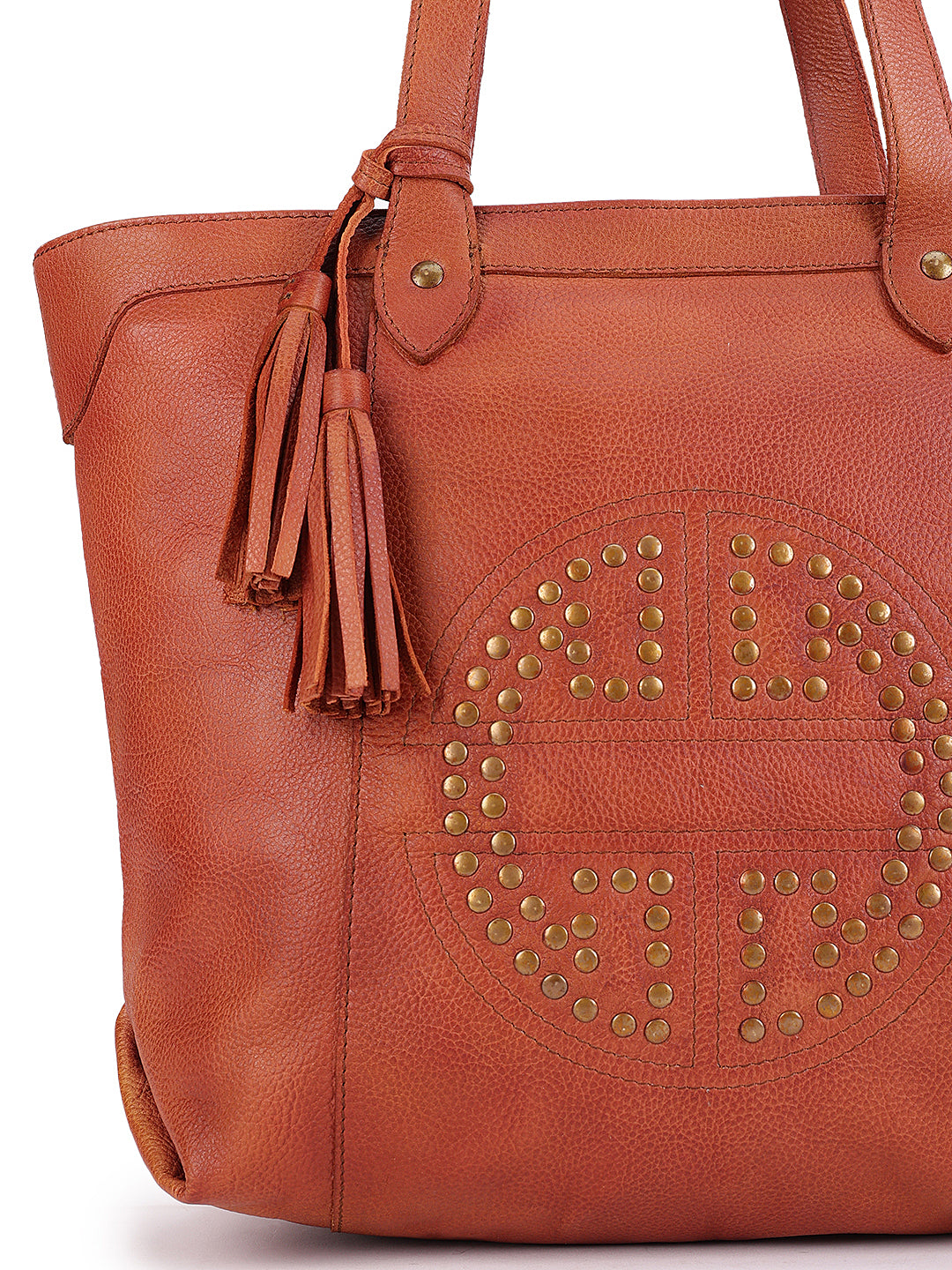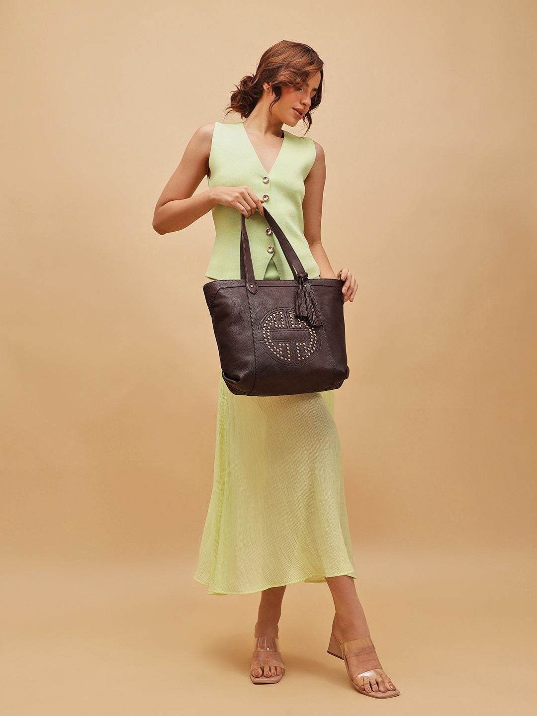A stylish tan tote crafted in rich leather, featuring the Classicuir logo in rivets, dual shoulder straps, and playful tassel accents—perfect for effortless, everyday sophistication.