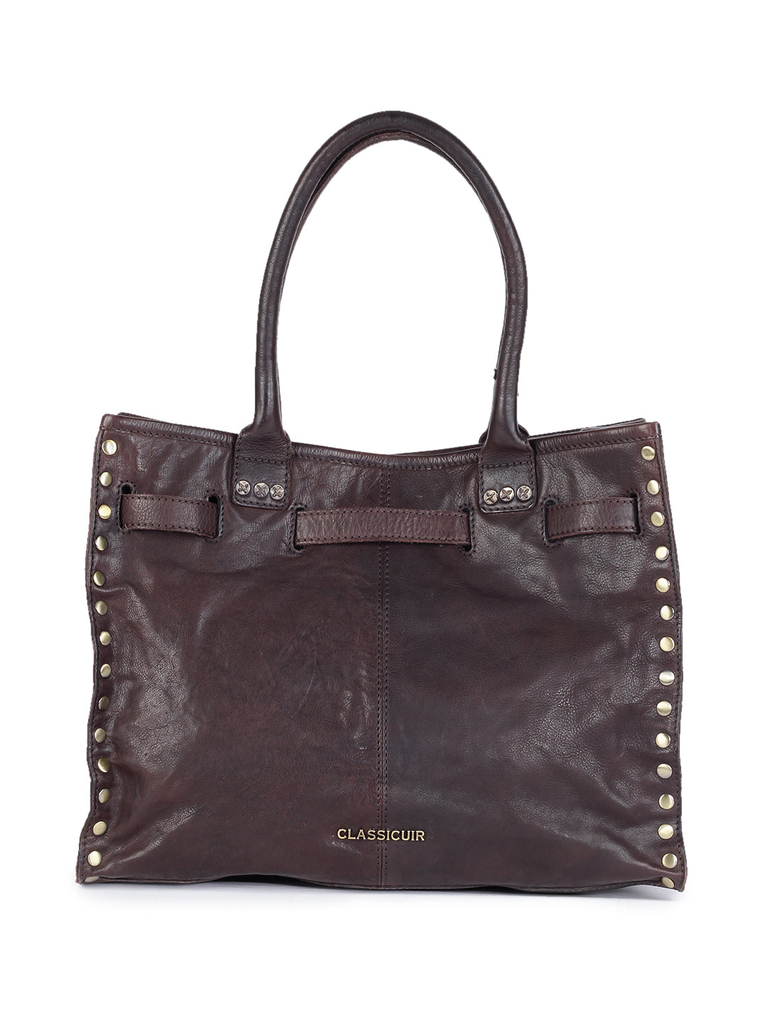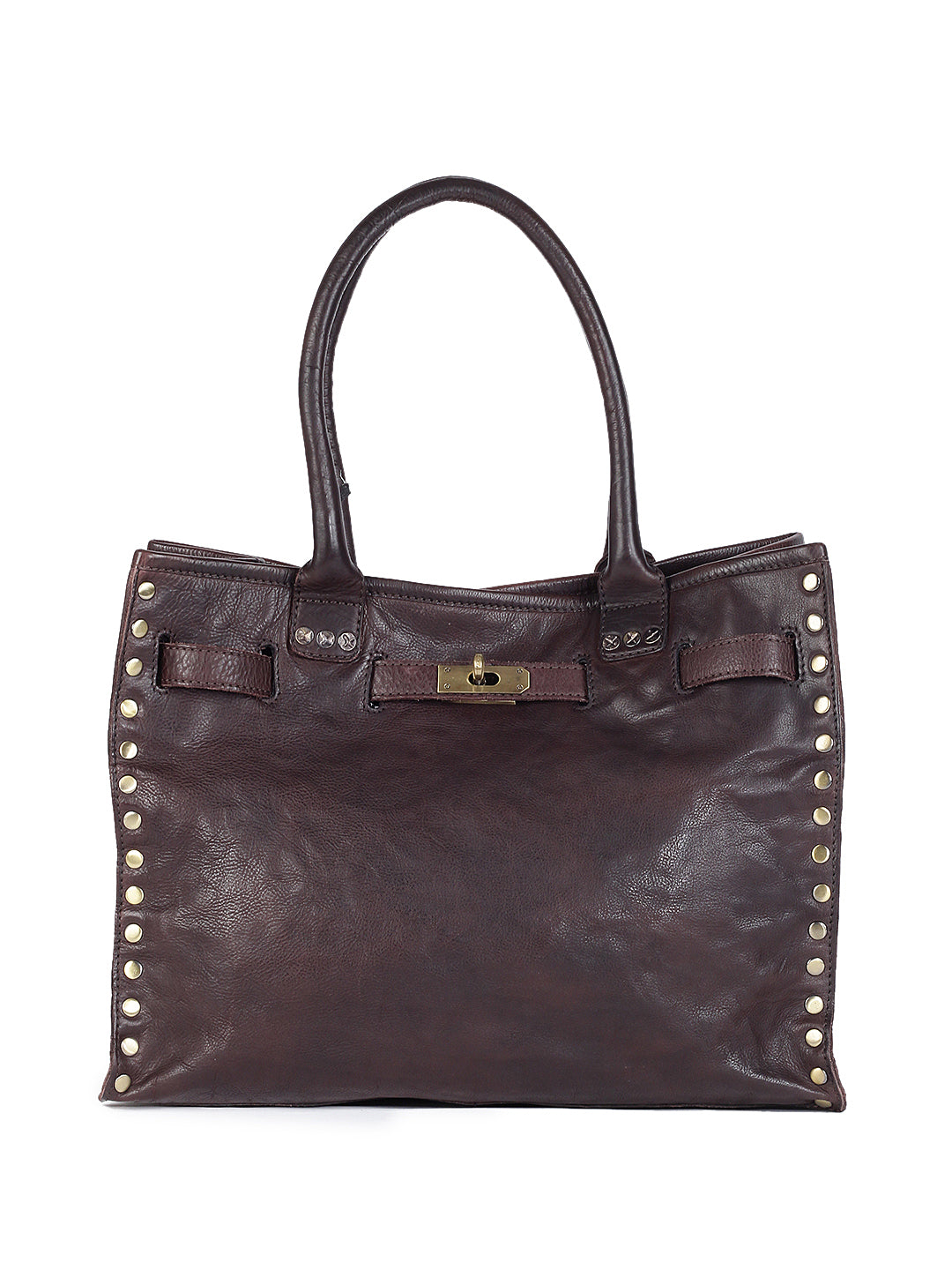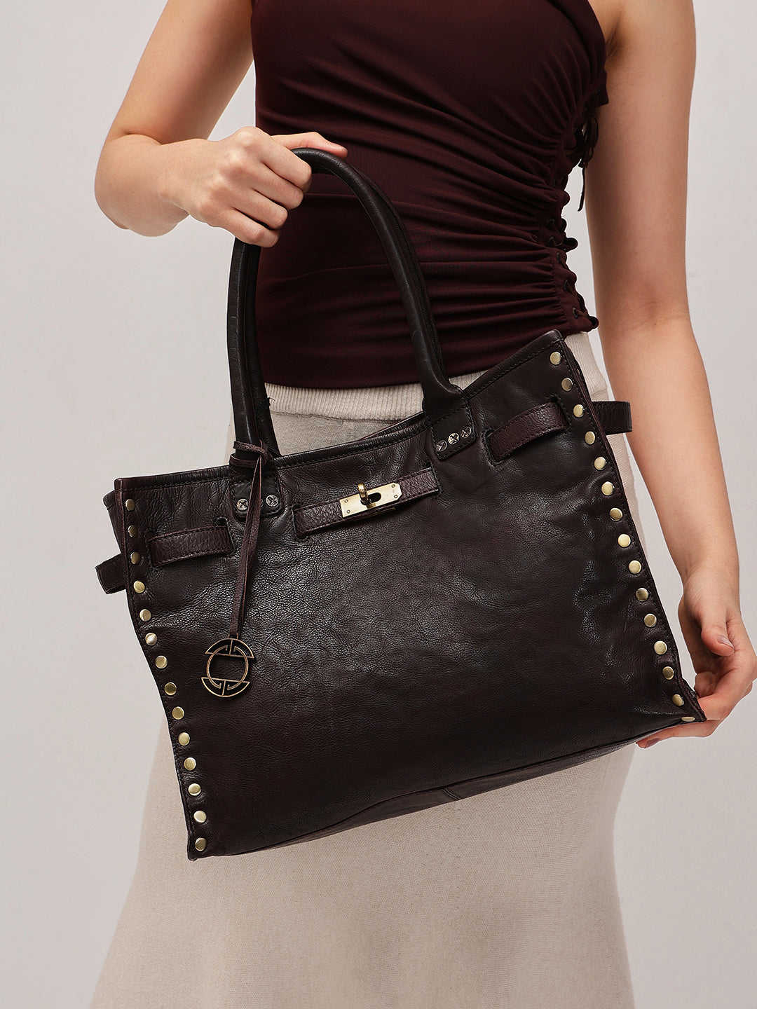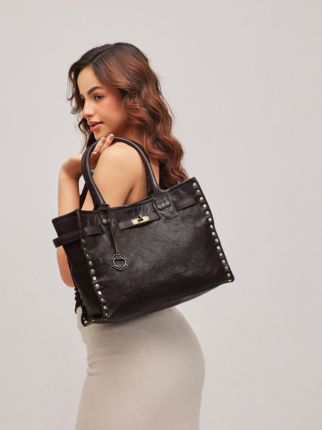 Elegant and empowering, this structured dark brown tote is crafted from rich genuine leather and adorned with antique gold studs for a hint of edge. A sleek turn-lock closure and sturdy top handles complete the sophisticated look.