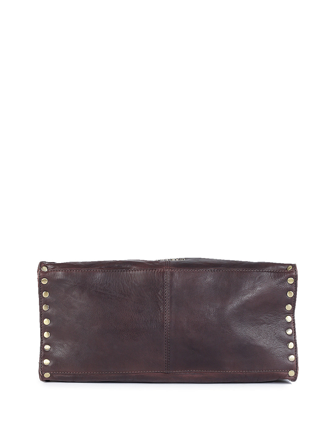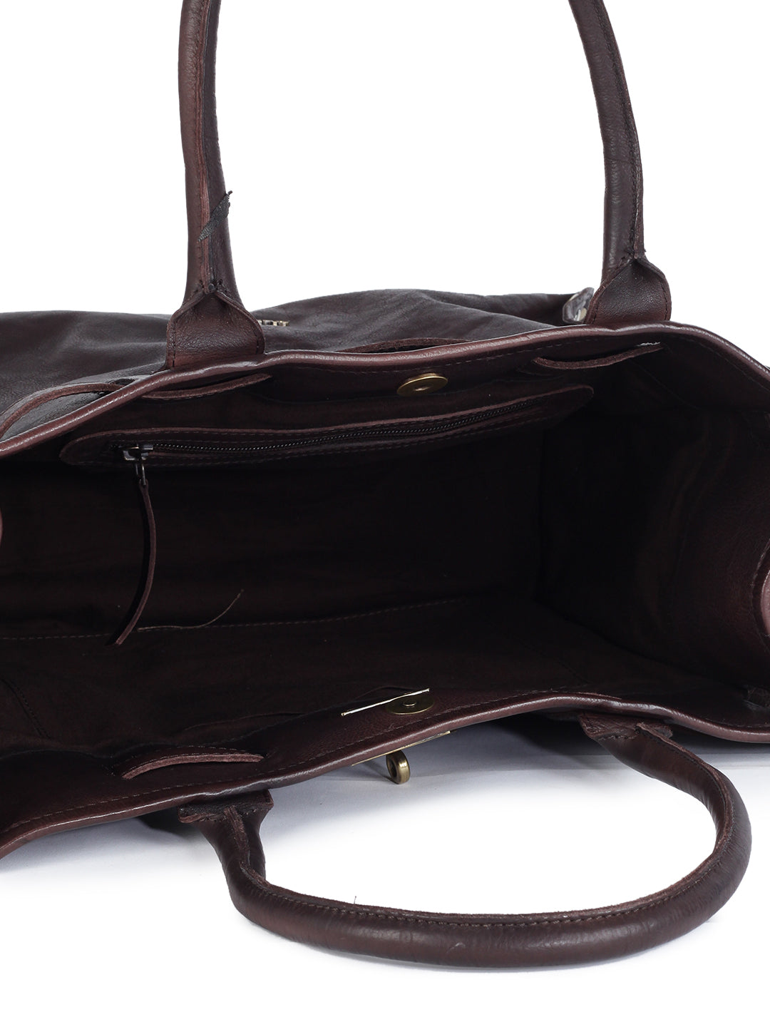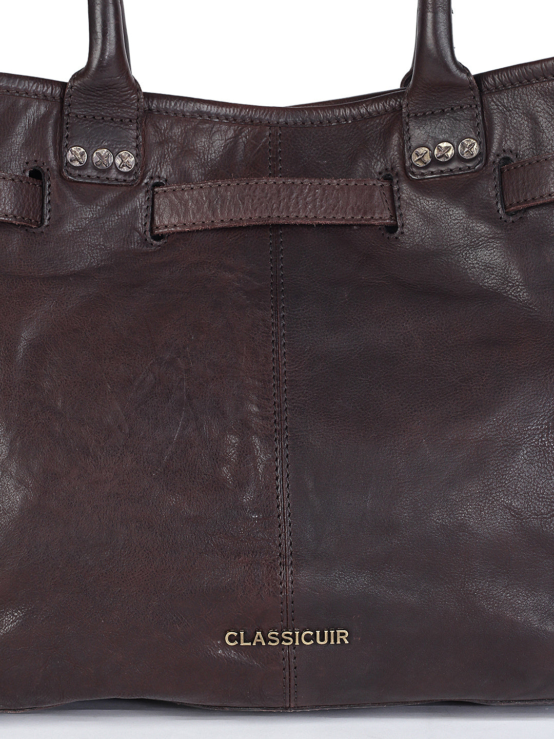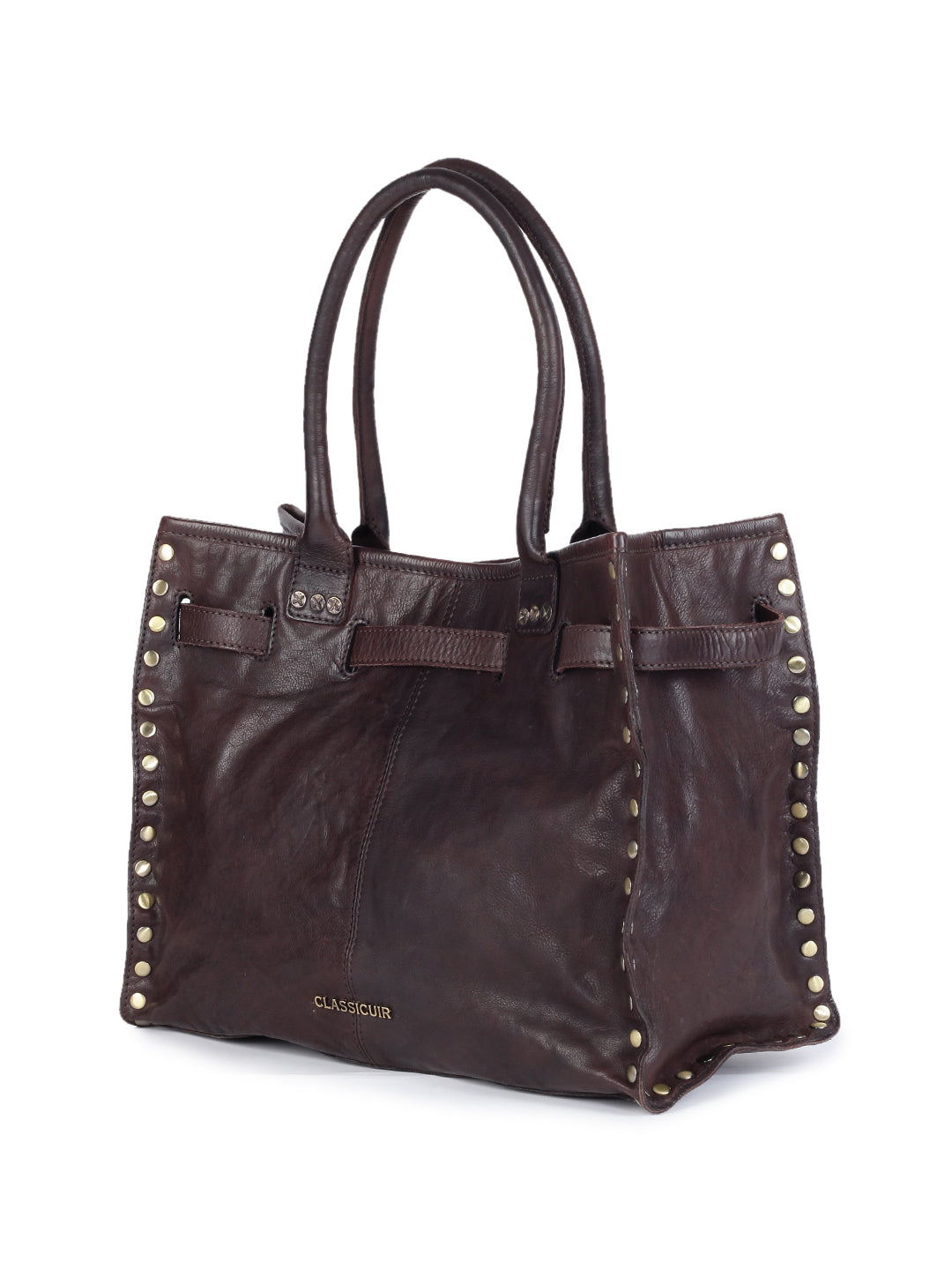 Elegant and empowering, this structured dark brown tote is crafted from rich genuine leather and adorned with antique gold studs for a hint of edge. A sleek turn-lock closure and sturdy top handles complete the sophisticated look.