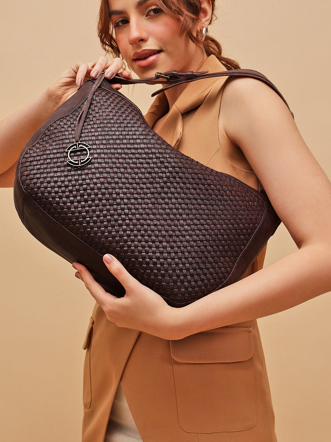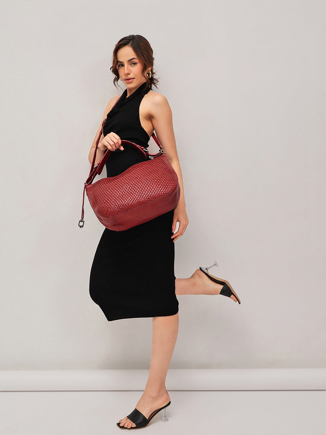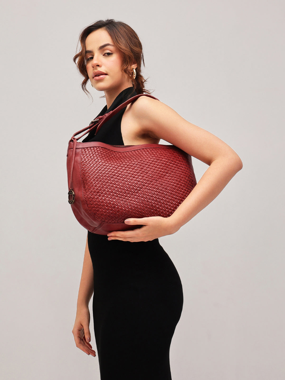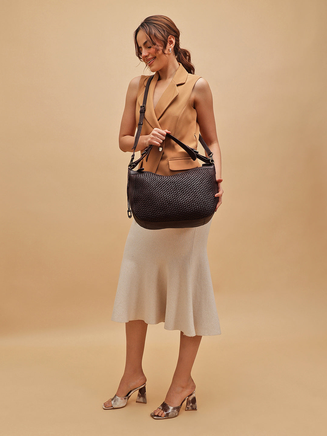 An ode to artisanal elegance, this woven beauty is where craftsmanship meets charm. The rich texture is balanced by sleek curves and a bold silhouette. Its broad, adjustable strap sits comfortably on the shoulder, perfect for day-to-night transitions.