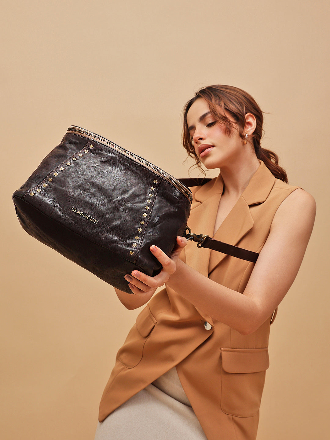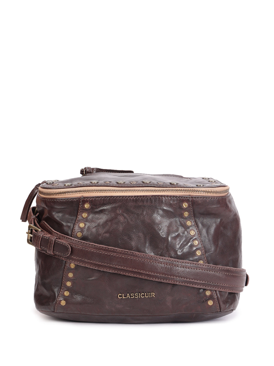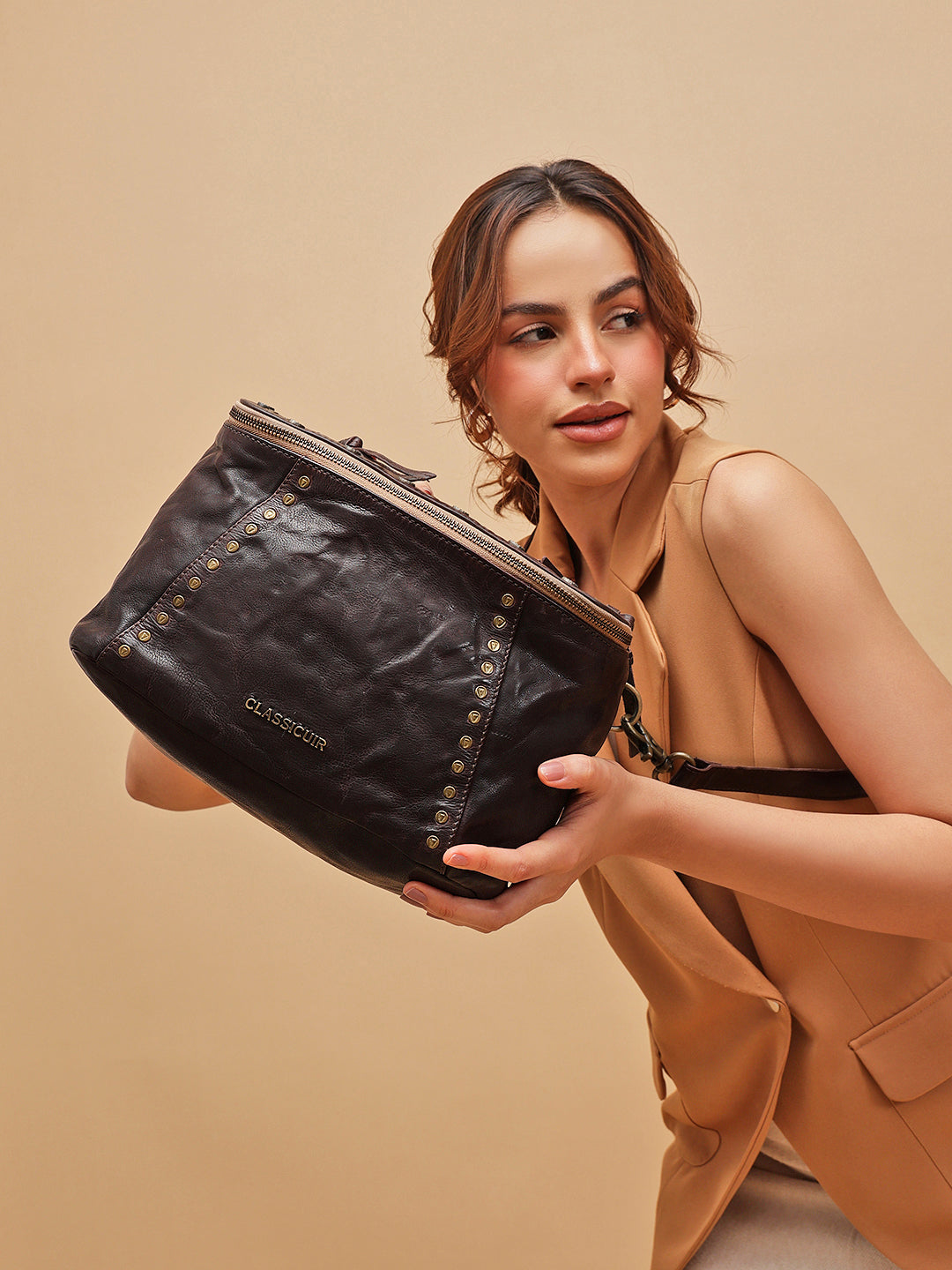The Odeon Distressed Rivert Messenger Bag features a rugged, distressed leather finish with metallic rivet detailing. It has a boxy silhouette with a wide zippered top and a single shoulder strap, blending vintage charm with practical design for everyday use.