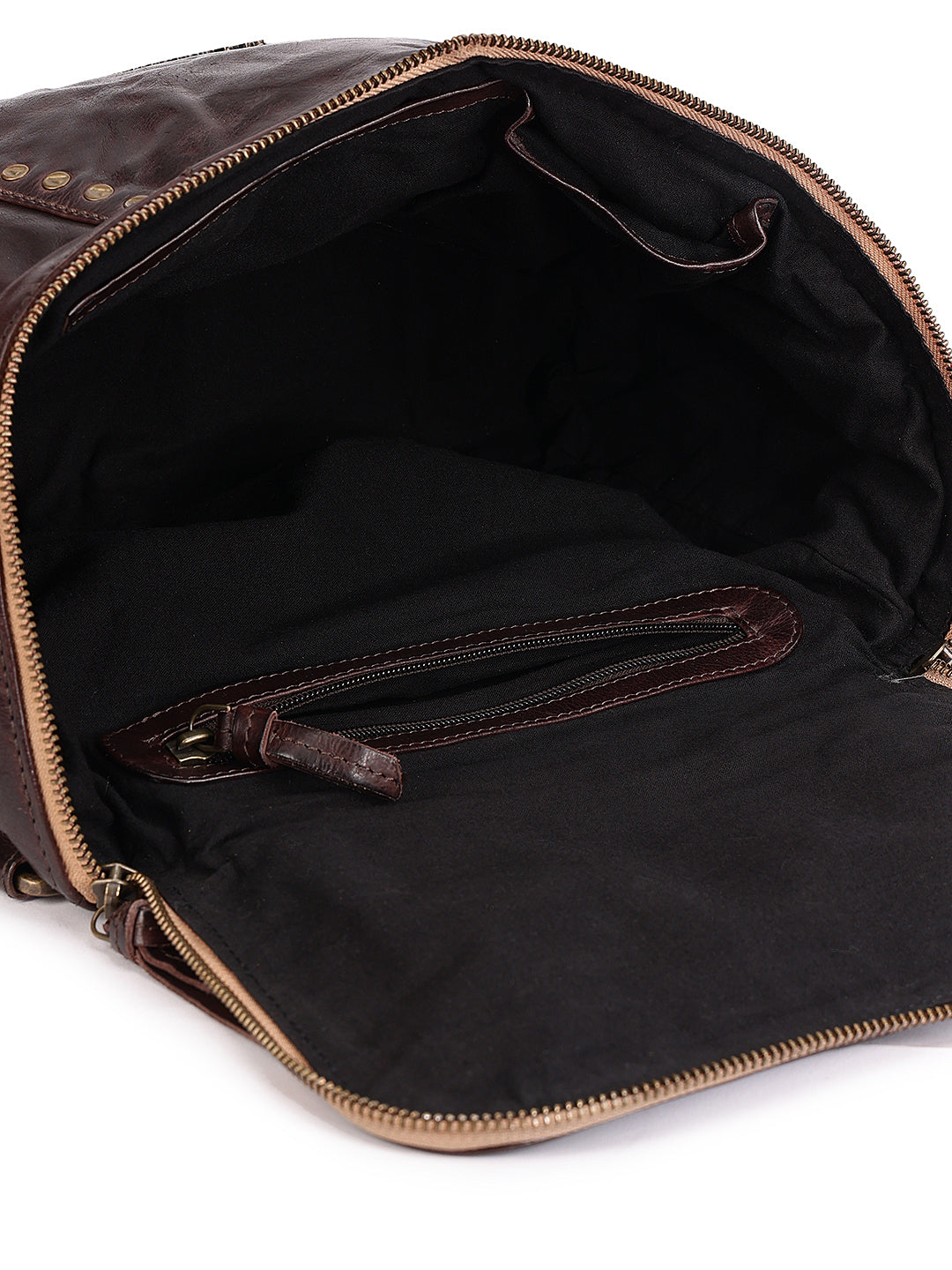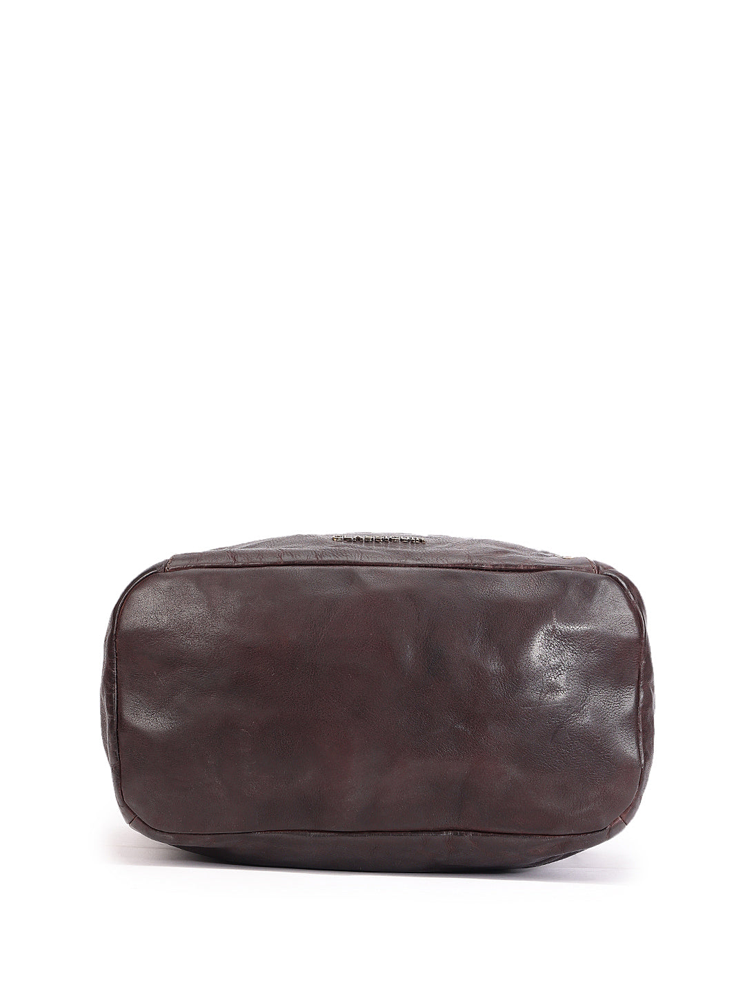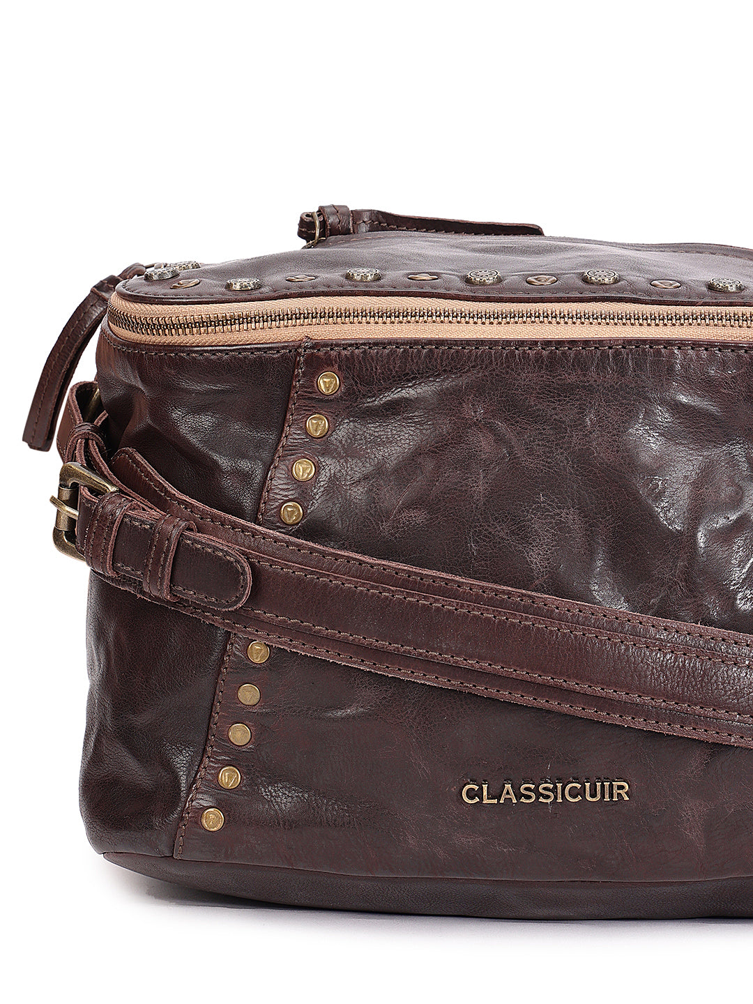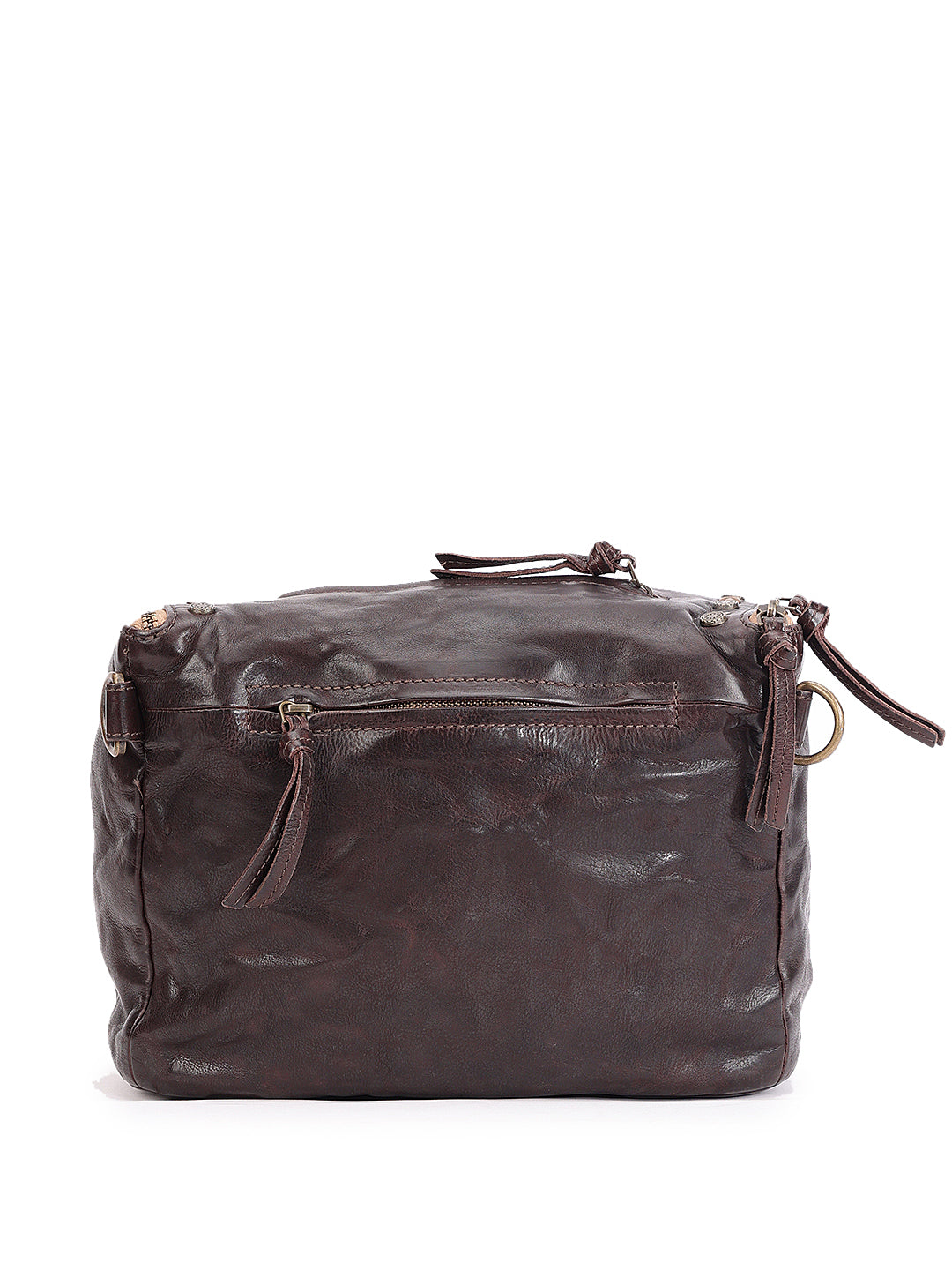 The Odeon Distressed Rivert Messenger Bag features a rugged, distressed leather finish with metallic rivet detailing. It has a boxy silhouette with a wide zippered top and a single shoulder strap, blending vintage charm with practical design for everyday use.