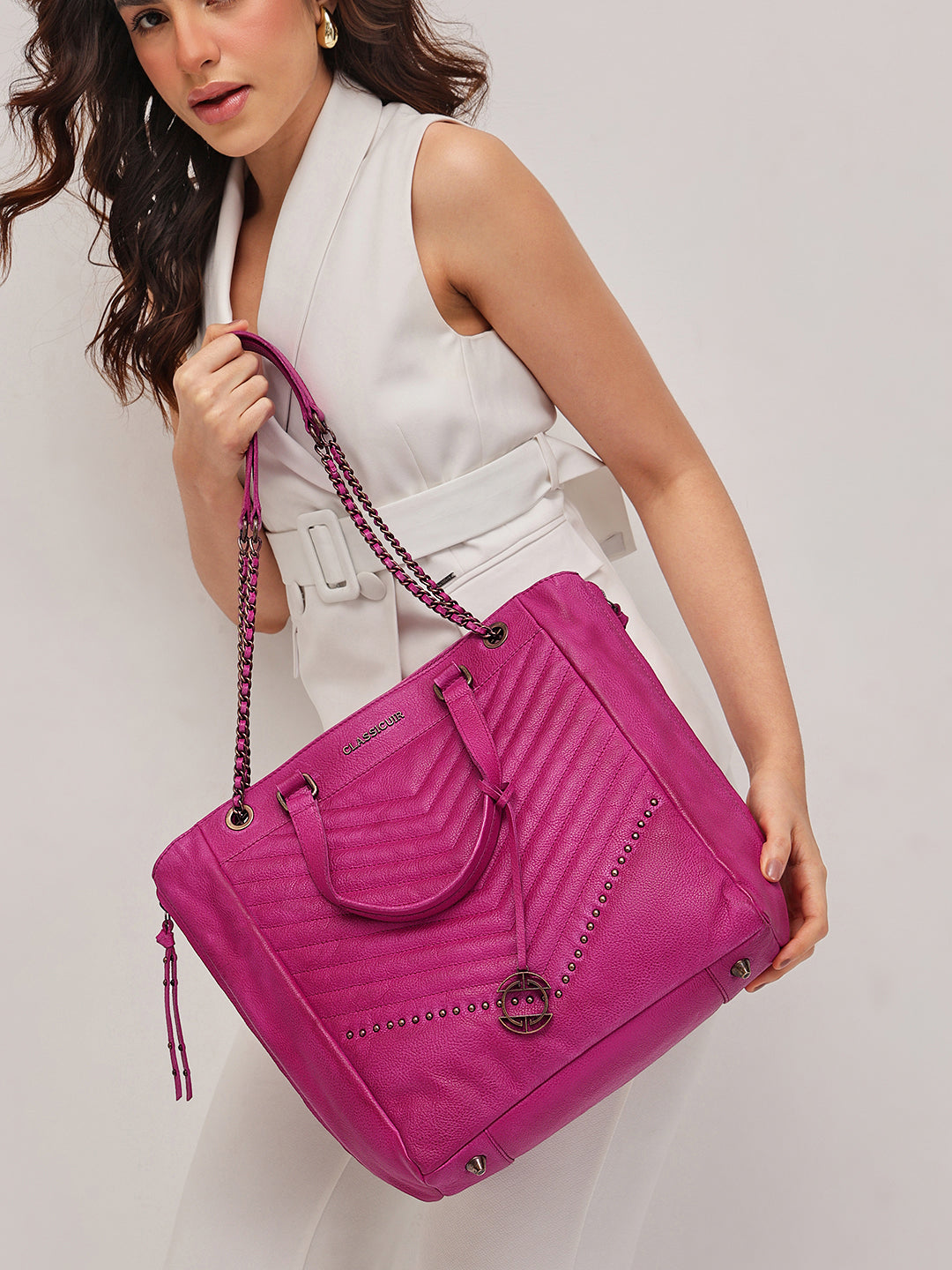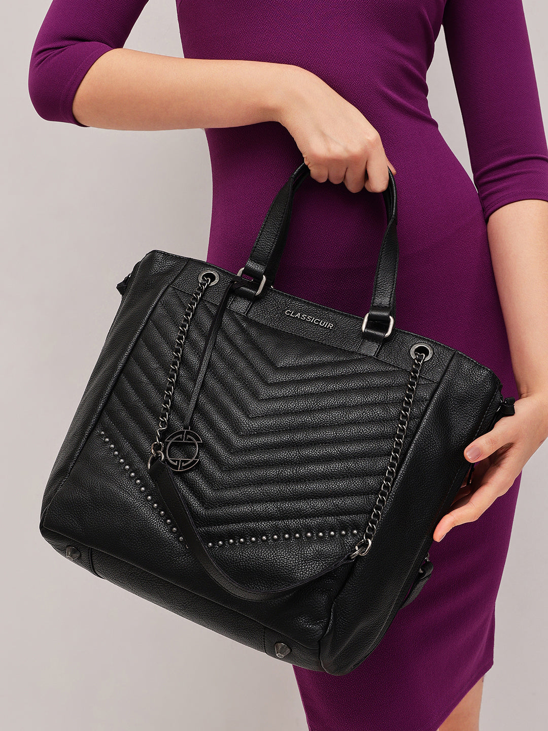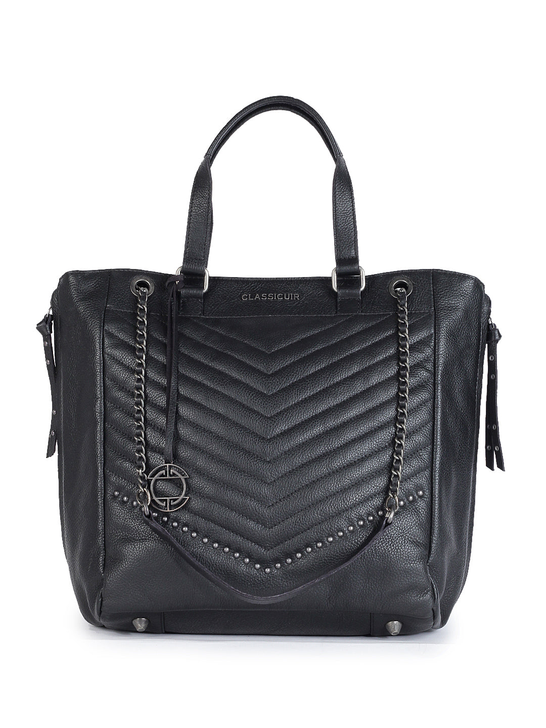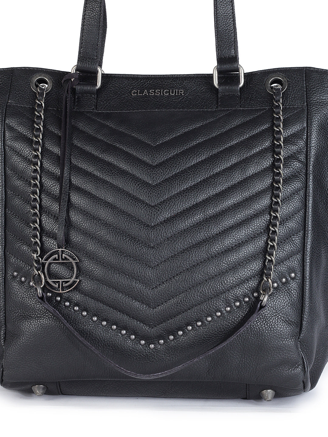 A bold classic reimagined, this black quilted tote in genuine leather boasts chevron stitching and subtle stud embellishments for a touch of edge. Finished with dual rolled handles and luxe chain-detailed shoulder straps, it’s as practical as it is elegant.