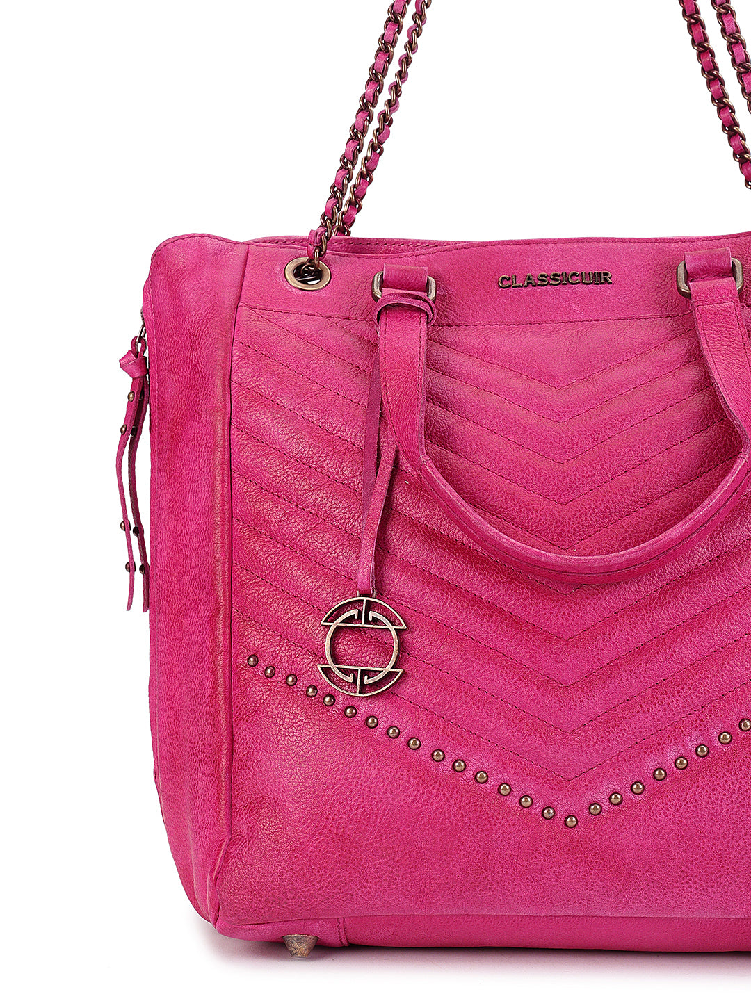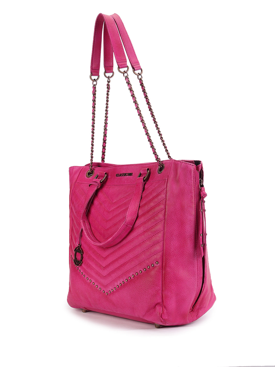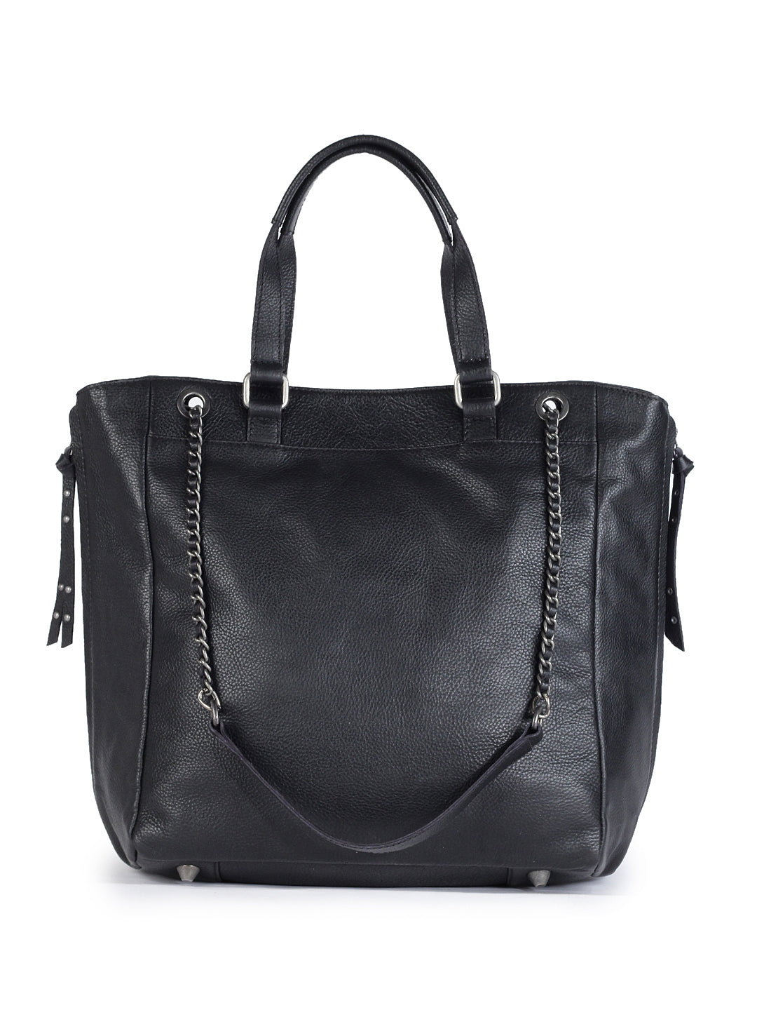 A bold classic reimagined, this black quilted tote in genuine leather boasts chevron stitching and subtle stud embellishments for a touch of edge. Finished with dual rolled handles and luxe chain-detailed shoulder straps, it’s as practical as it is elegant.