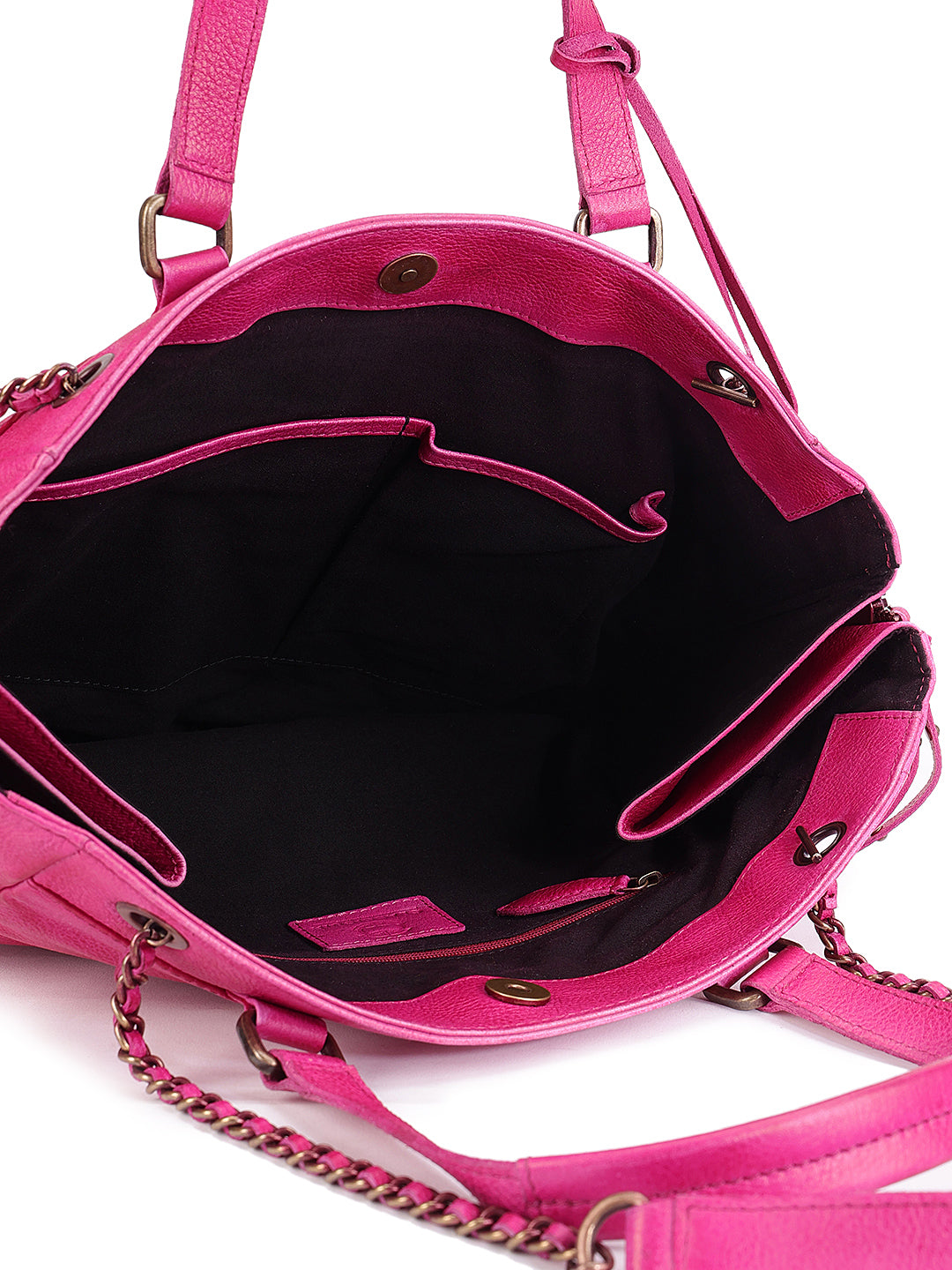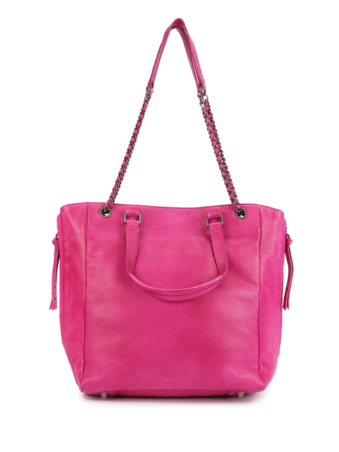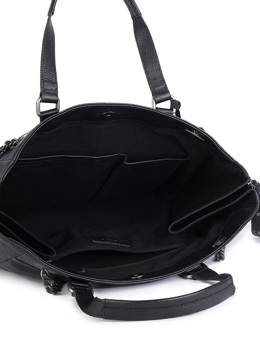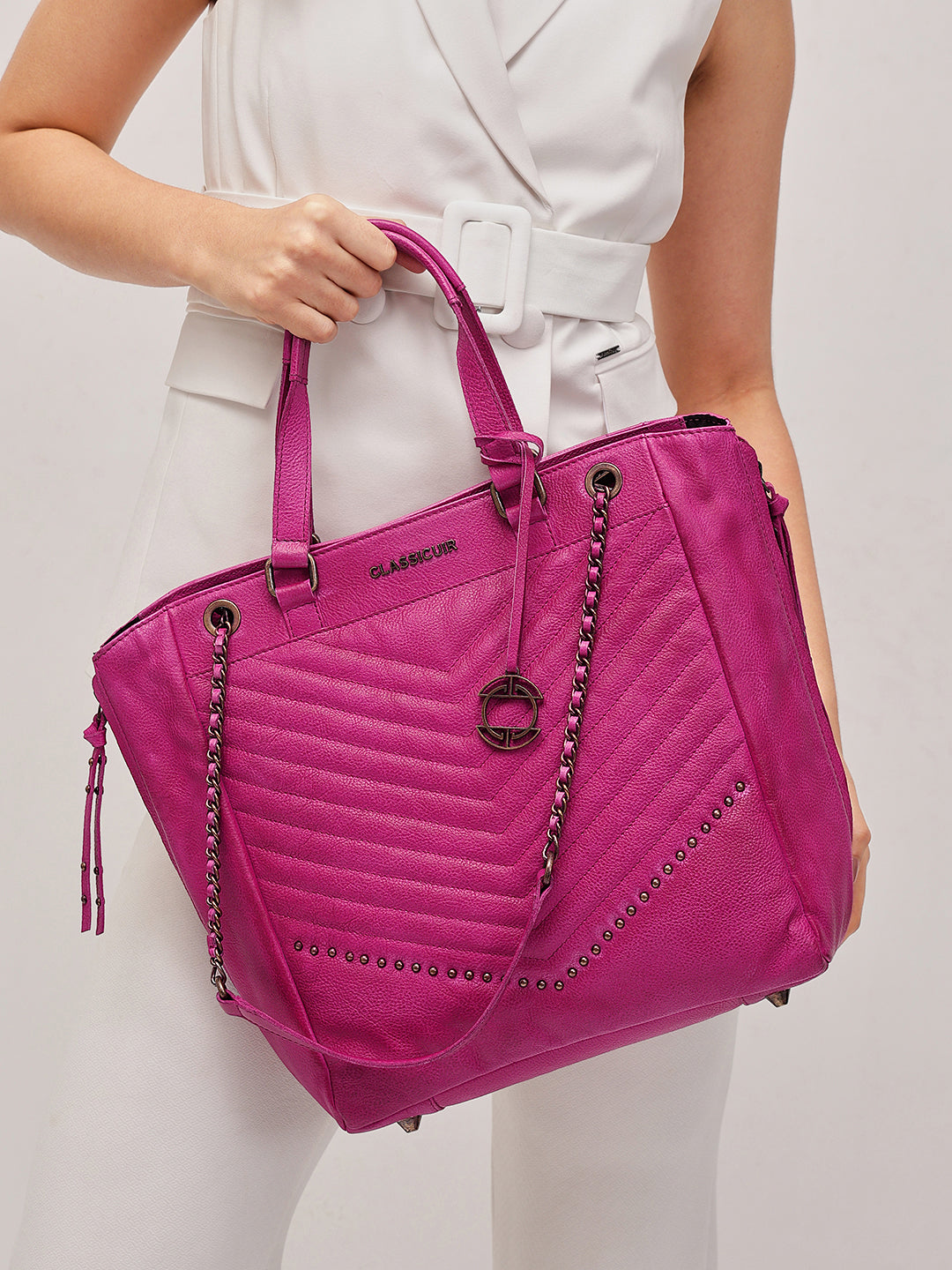 A bold classic reimagined, this black quilted tote in genuine leather boasts chevron stitching and subtle stud embellishments for a touch of edge. Finished with dual rolled handles and luxe chain-detailed shoulder straps, it’s as practical as it is elegant.